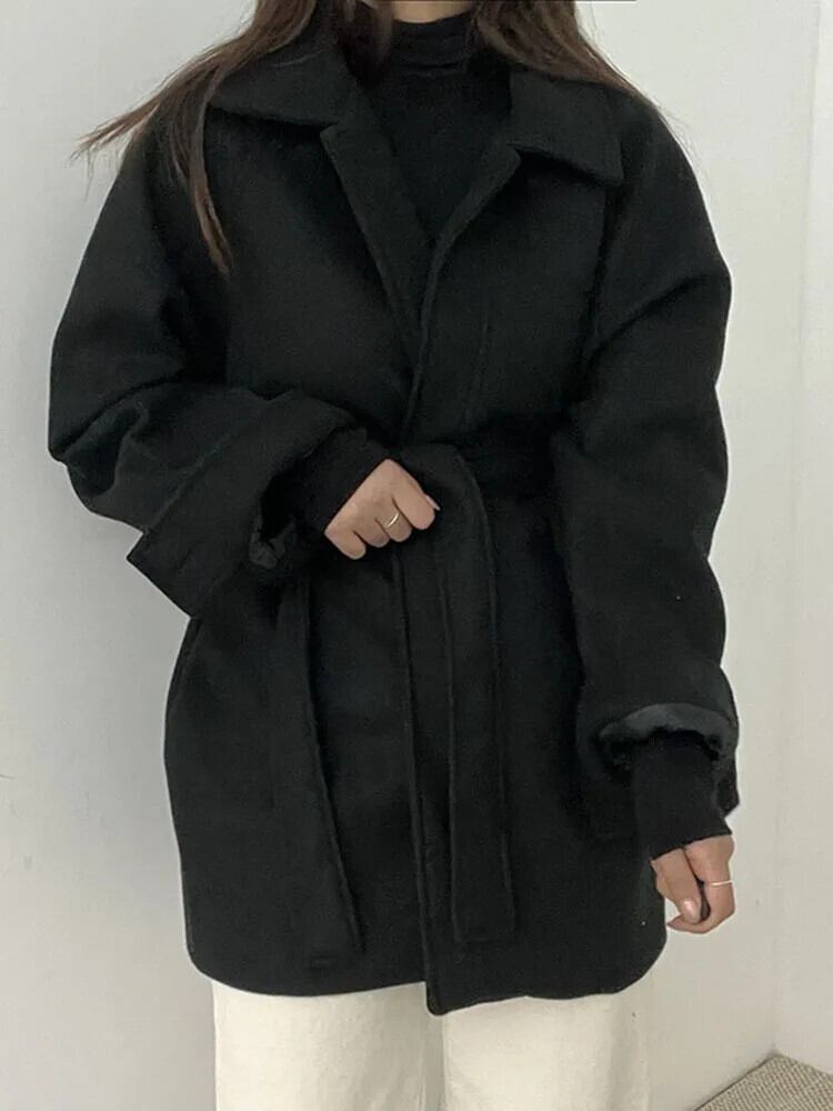 [EWQ] シングルボタンラペル調節可能ウエスト長袖黒オートカラーオーバーコートジャケット秋ウィウンター 6U5972 ロング ブラック オータム 秋物 アジャスタブル