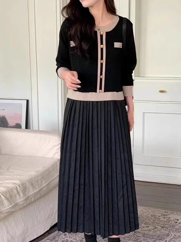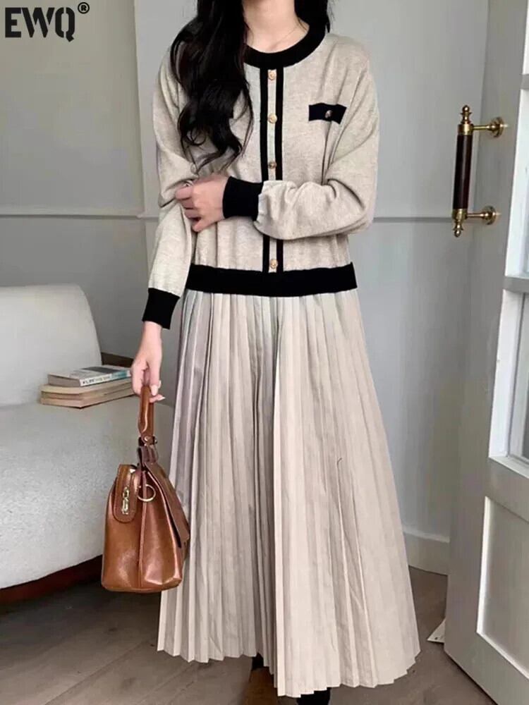 【EWQ】長袖コントラストカラーシングルブレストOネックパッチワークニットプリーツワンピース秋春16U5974 ロング スプリング 春物 オータム 秋物
