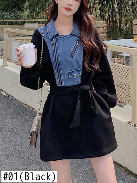 [EWQ] ラペルジッパーデニムブラックパッチワークコントラストカラー長袖ドレス秋春 U5977 ロング スプリング 春物 オータム 秋物