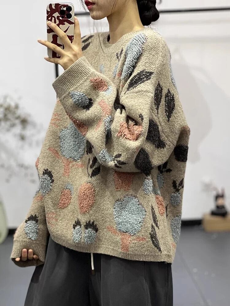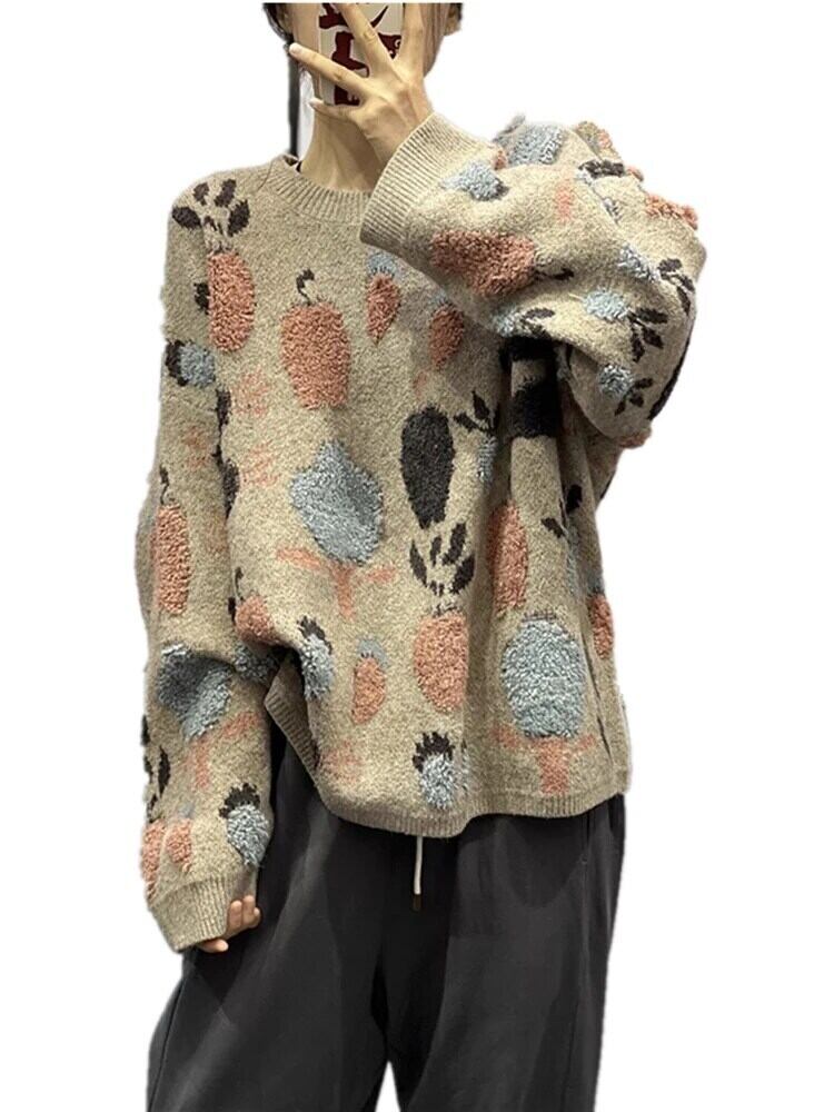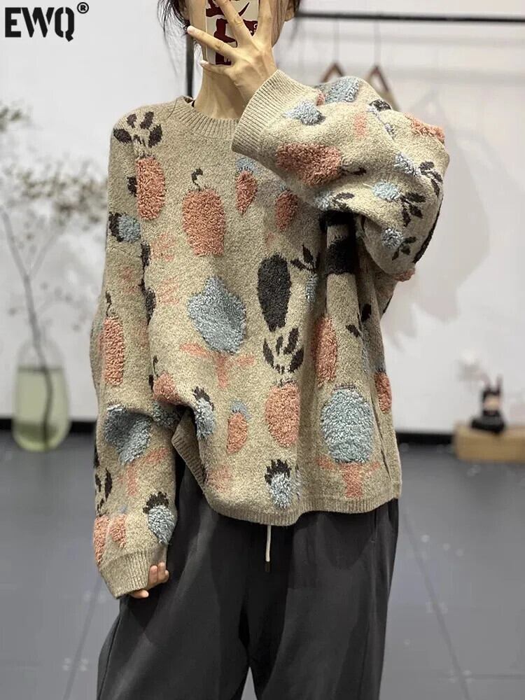 [EWQ] コントラストカラーカーキ O ネックプルオーバープリントニットセータートップゆったり暖かい秋冬 16U6299 オータム 秋物 ウィンター 冬物 Oネック