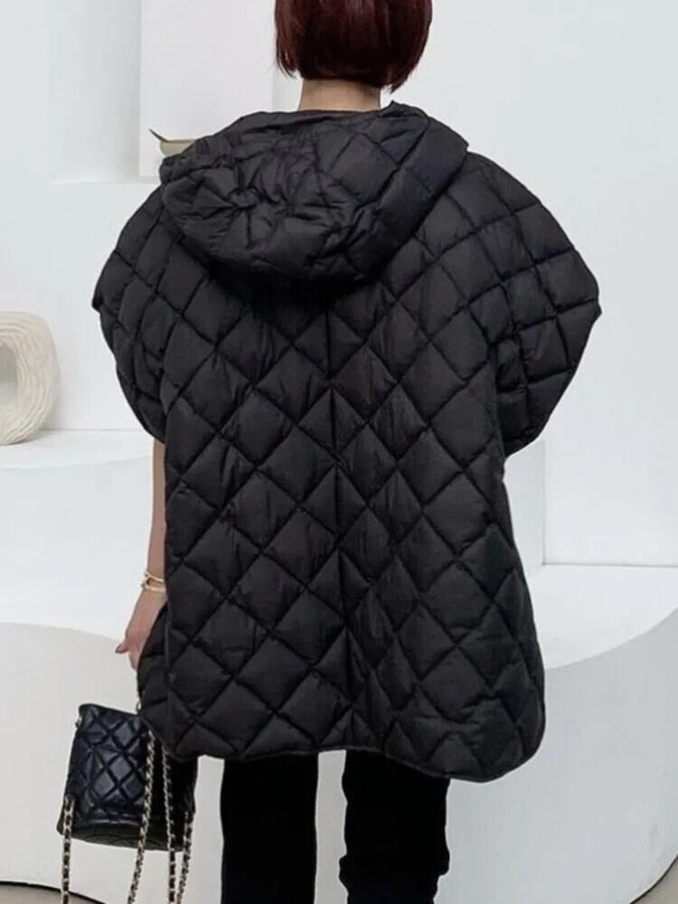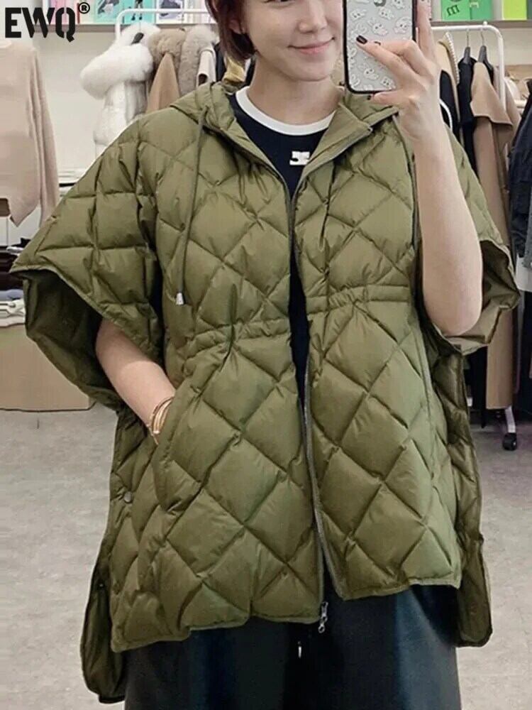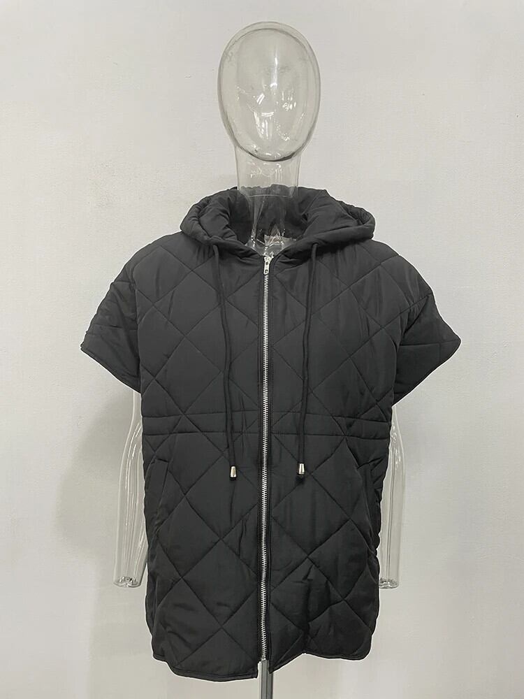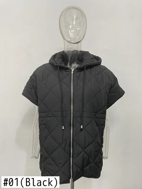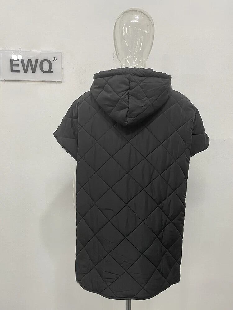 [EWQ] ジッパー ノースリーブ 巾着 チェック柄 エンボス ジャケット ふっくら 厚手 暖かい フード付き 中綿入り ベスト 秋冬 16U5885 コットン オータム 秋物 ウィンター 冬物