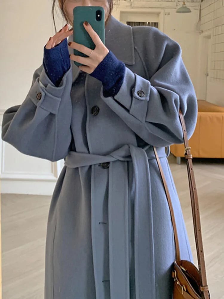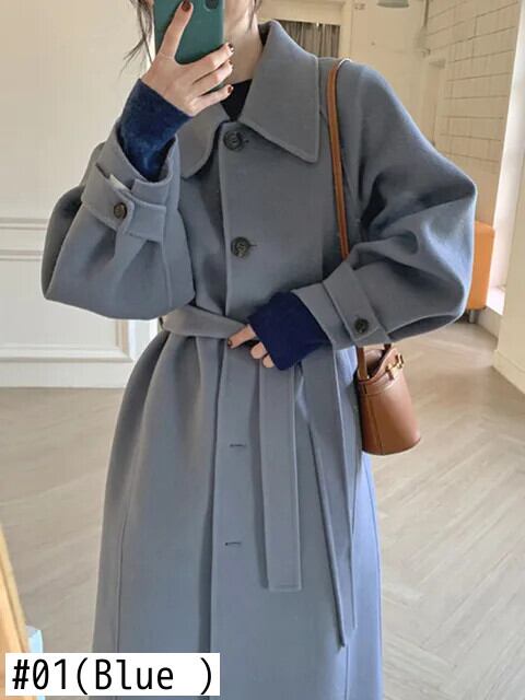 [EWQ] ラペルシングルブレストシンプルウエスト痩身ベルト長袖ポケットウールオーバーコートトップ秋冬 16U5838 ロング オータム 秋物 ウィンター 冬物 ハーネス