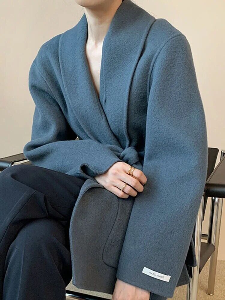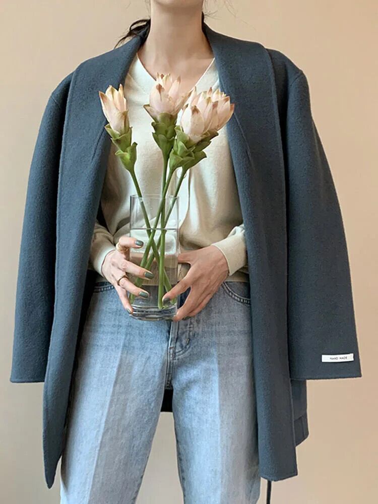 [EWQ] 無地 ブルー 秋冬 ウエスタン V ネック タイアップ ウエスト痩身 大きポケット 万能ウールコート 16U5730 オータム 秋物 ウィンター 冬物 Vネック ソリッドカラー