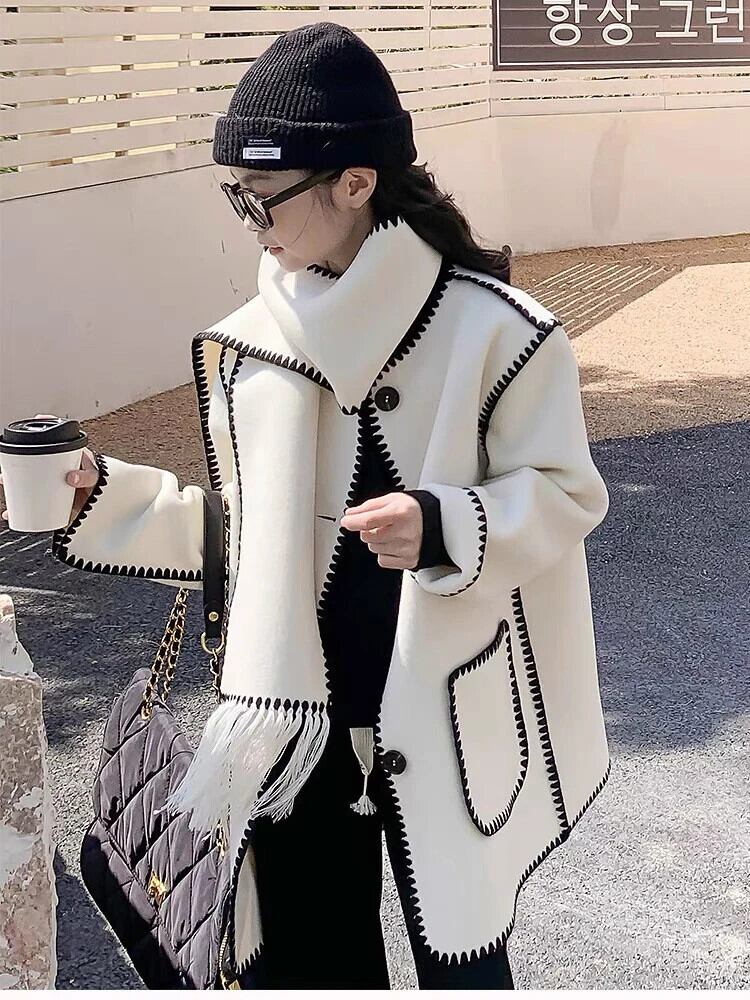 [EWQ] 長袖ブライトスレッドトレンドレディース暖かいルーズウールコートとスカーフ秋ジャケット ロング オータム 秋物