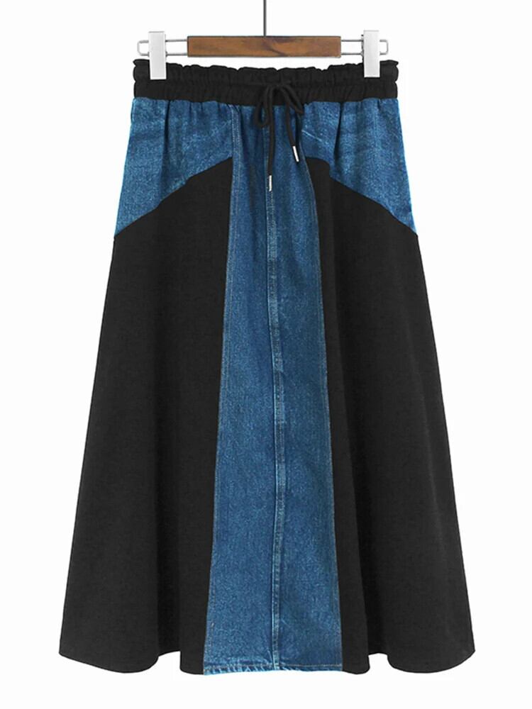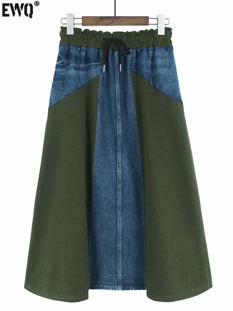 [EWQ] 弾性巾着デニムパッチワークスカートアーミーグリーンルーズオールマッチ秋冬 16U5409 エラスティック 伸縮 オータム 秋物 ウィンター 冬物