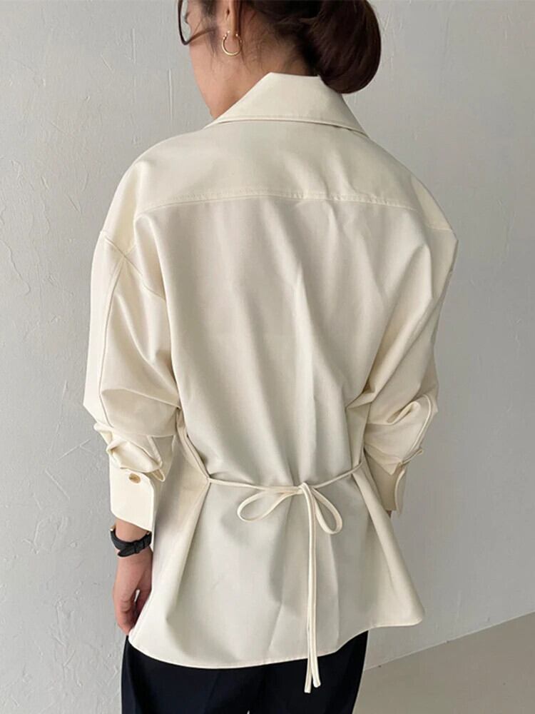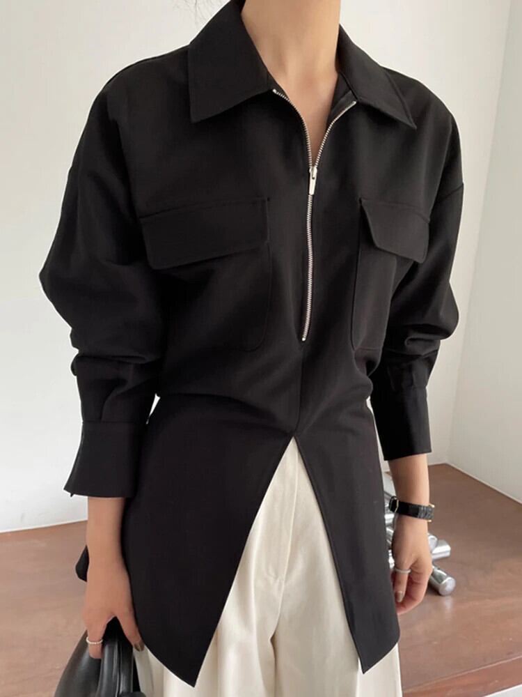 [EWQ] ミニマリストラペルジッパーシャツダブルポケットバックレースアップ分割秋冬トップ 16U5121 オータム 秋物 ウィンター 冬物