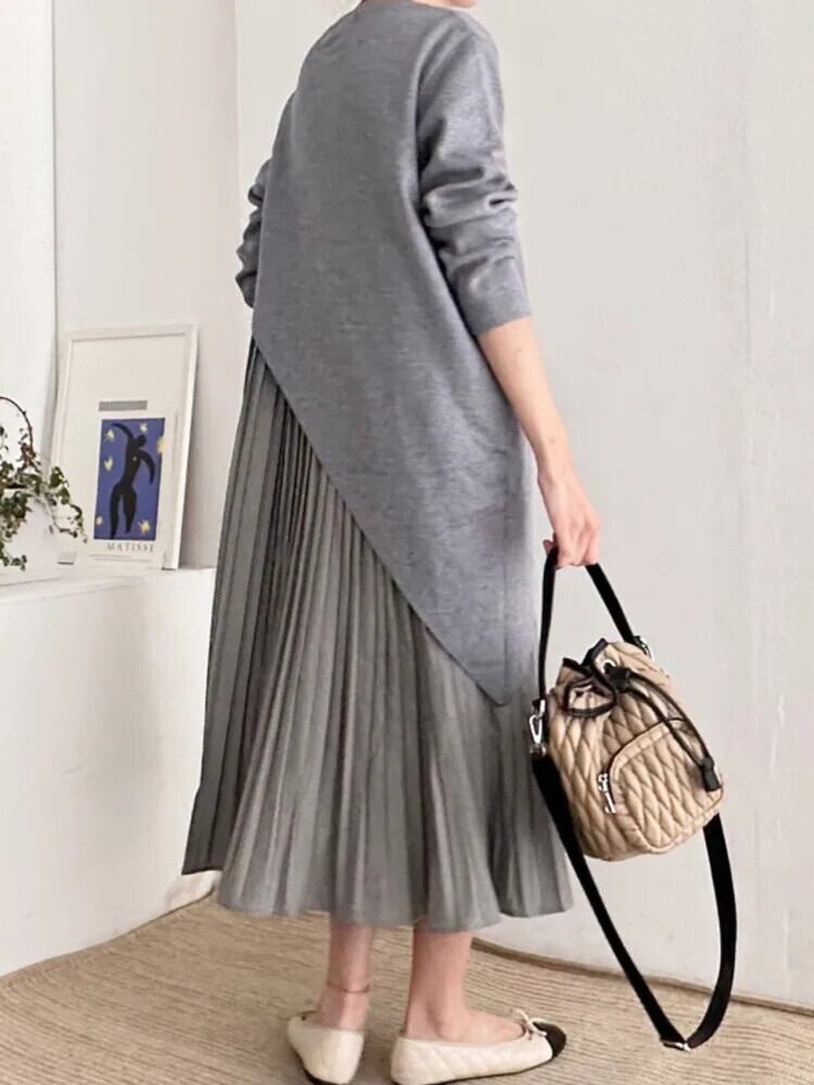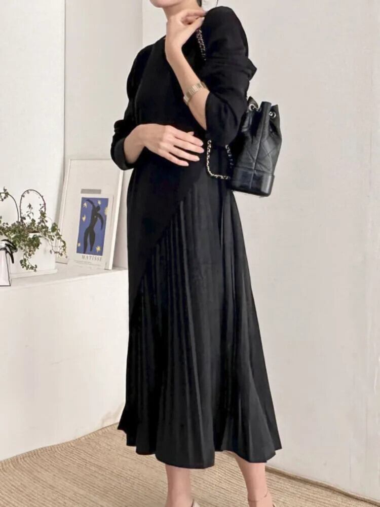 [EWQ] マルチカラー O ネック長袖不規則ルーズスプライスプリーツドレス春秋 6U6067 ロング スプリング 春物 オータム 秋物 Oネック