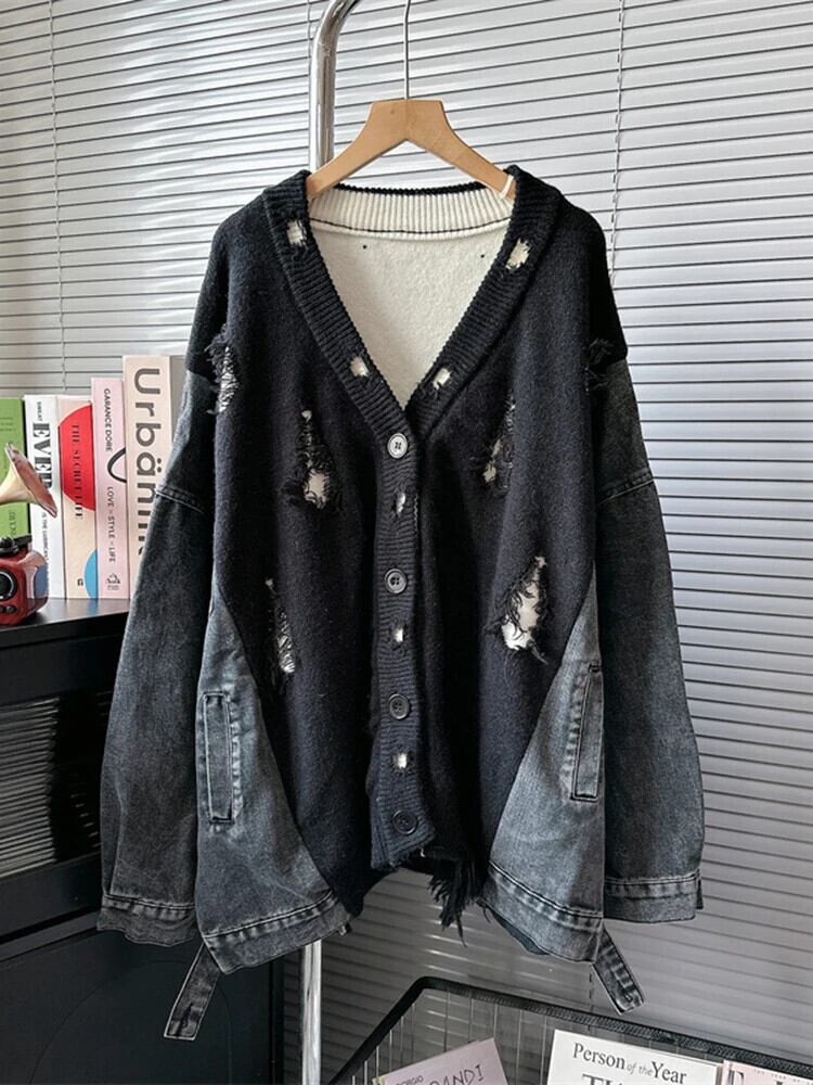 [EWQ] ストリート アウト バリホール デニム パッチワーク Vネック シングルブレスト カーディガン セーター ルーズ ニット トップス