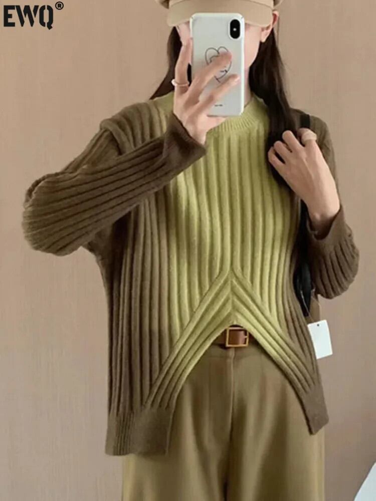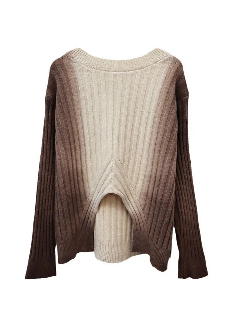 [EWQ] 長袖 O ネック スプリット グラデーション カラー ニット トップス プルオーバー セーター レディース 秋冬 16U5995 ロング オータム 秋物 ウィンター 冬物 Oネック