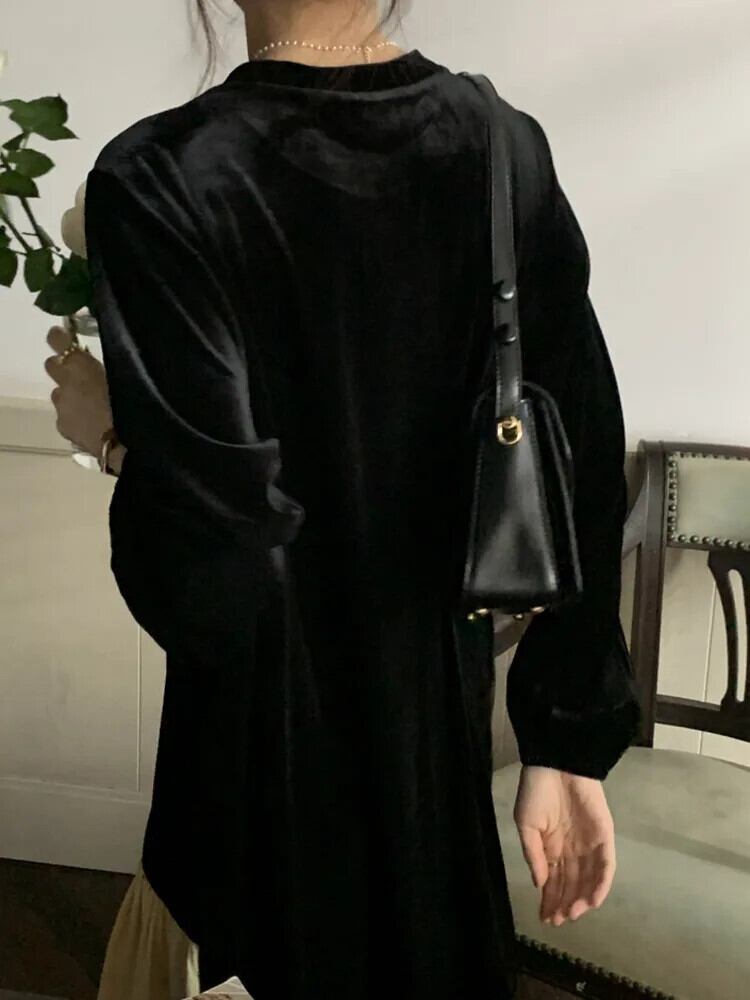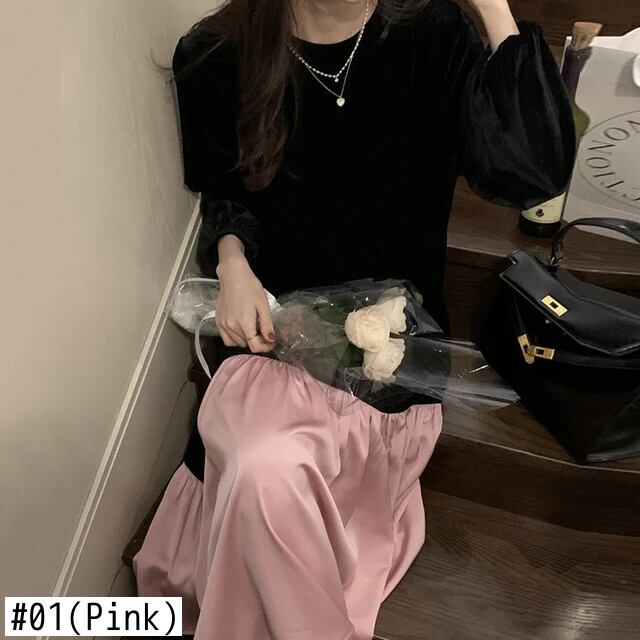 [EWQ] フリルパッチワークコントラストベルベットドレス長袖 O ネックルーズドレス秋冬 16U5085 ロング オータム 秋物 ウィンター 冬物 Oネック