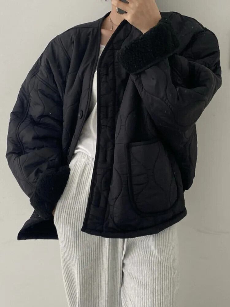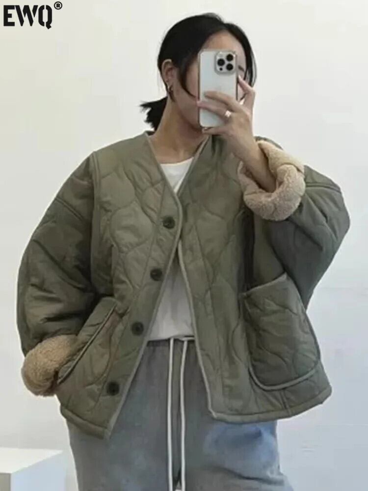 [EWQ] グリーン V ネックシングルブレストウェーブエンボス長袖綿パッド入りコートジャケット秋冬ダウンパーカー U606 ロング コットン オータム 秋物 ウィンター 冬物 Vネック