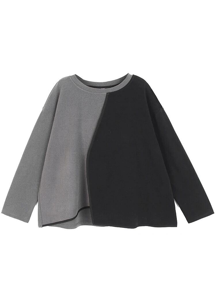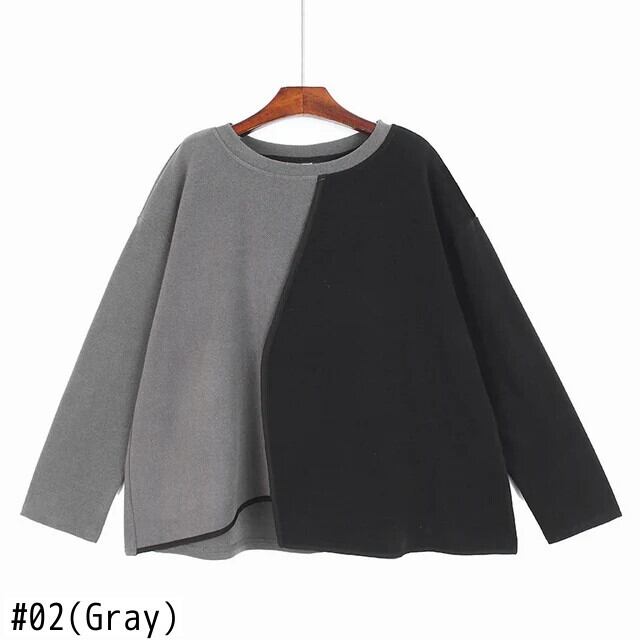 [EWQ] 非対称コントラストカラースウェット長袖ルーズプルオーバートップ秋冬 16U5411 ロング シャツ オータム 秋物 ウィンター 冬物