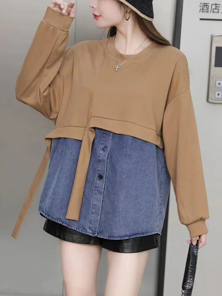 [EWQ]コントラストカラーデニムパッチワークシングルブレスト長袖Oネックスウェットトップス秋春16U5847 ロング スプリング 春物 オータム 秋物