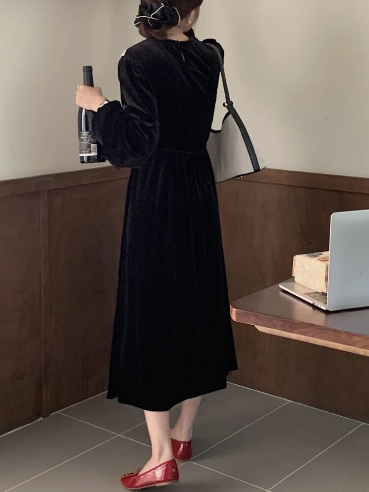 [EWQ] ブラックベルベットドレス O ネックパッチワークアウトジャカードドレス Vestido 秋冬 6U5316 オータム 秋物 ウィンター 冬物 Oネック
