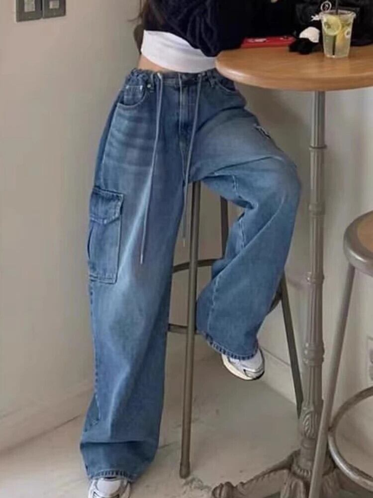 [EWQ] 巾着ウエスト マルチポケット ワーク ワイドレッグ ジーンズ 長ズボン デニム パンツ レディース 秋冬 16U6198 ロング オータム 秋物 ウィンター 冬物 ワイドパンツ ポケット多め
