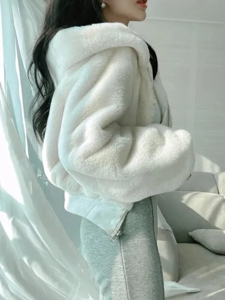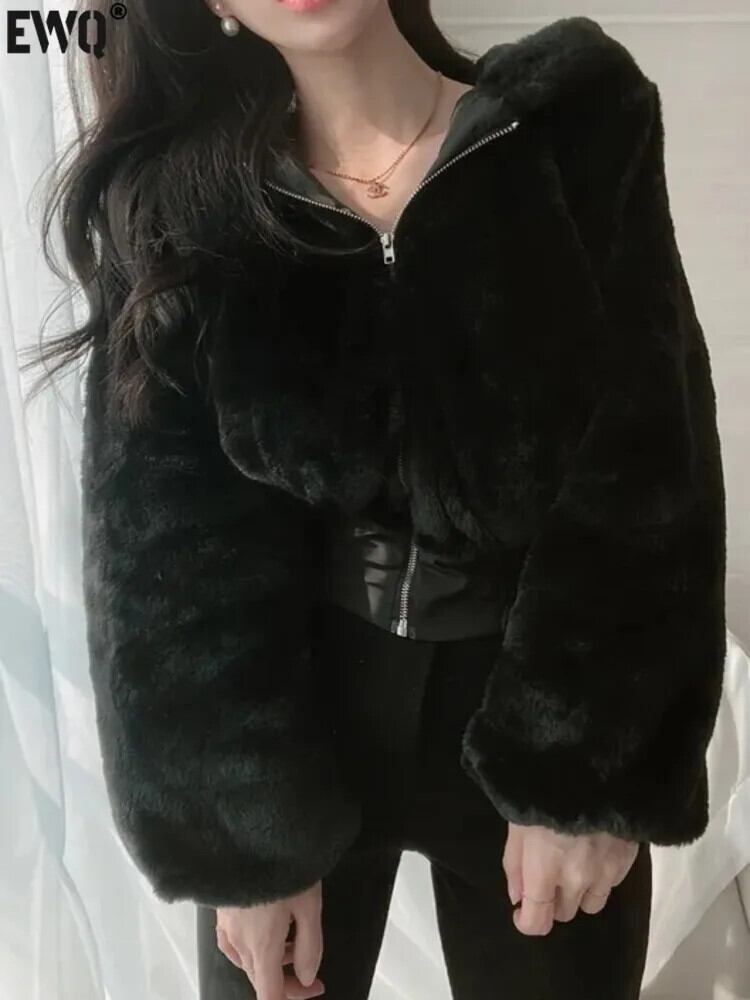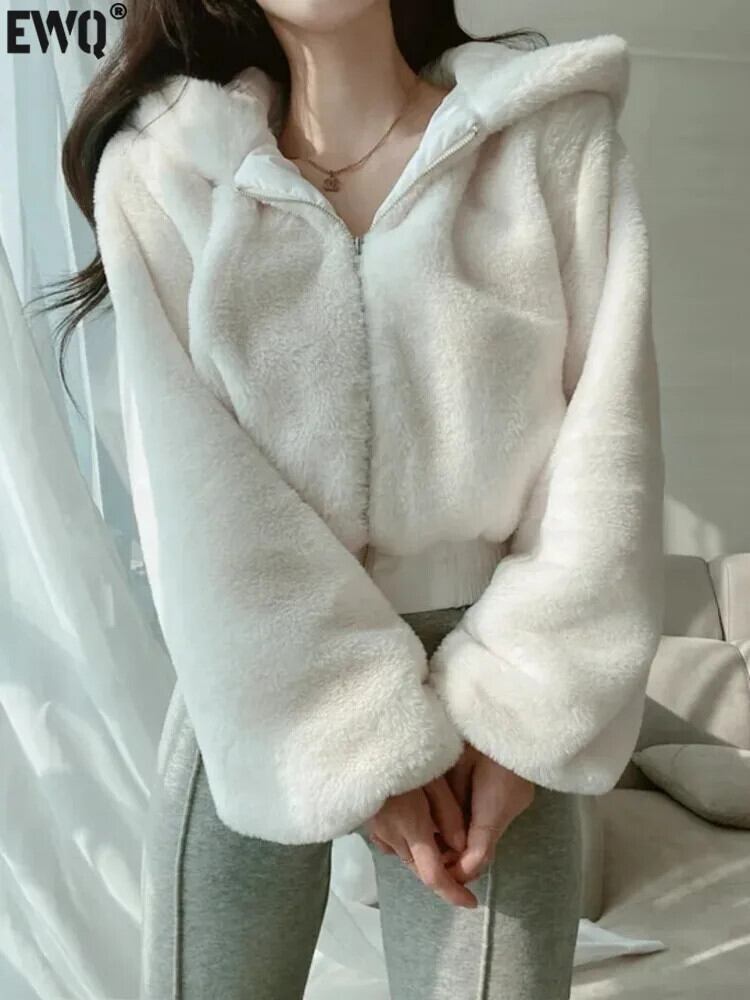 [EWQ] ブラックホワイトジッパー付きフード付きルーズぬいぐるみ長袖ショートジャケットカーディガンコート秋冬アウター 6U5766 ロング レッド オータム 秋物 ウィンター 冬物