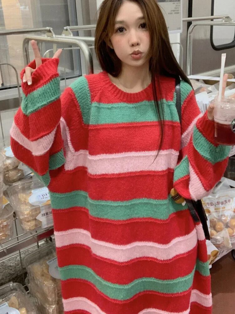 [EWQ] クリスマス特大コントラストカラー赤緑ストライプ O ネックレディースロングニットセータードレス秋冬 16U6118 レッド オータム 秋物 ウィンター 冬物 Oネック グリーン