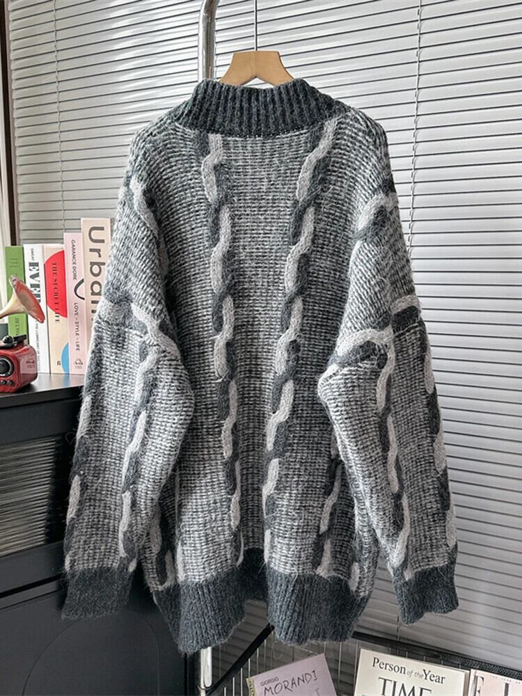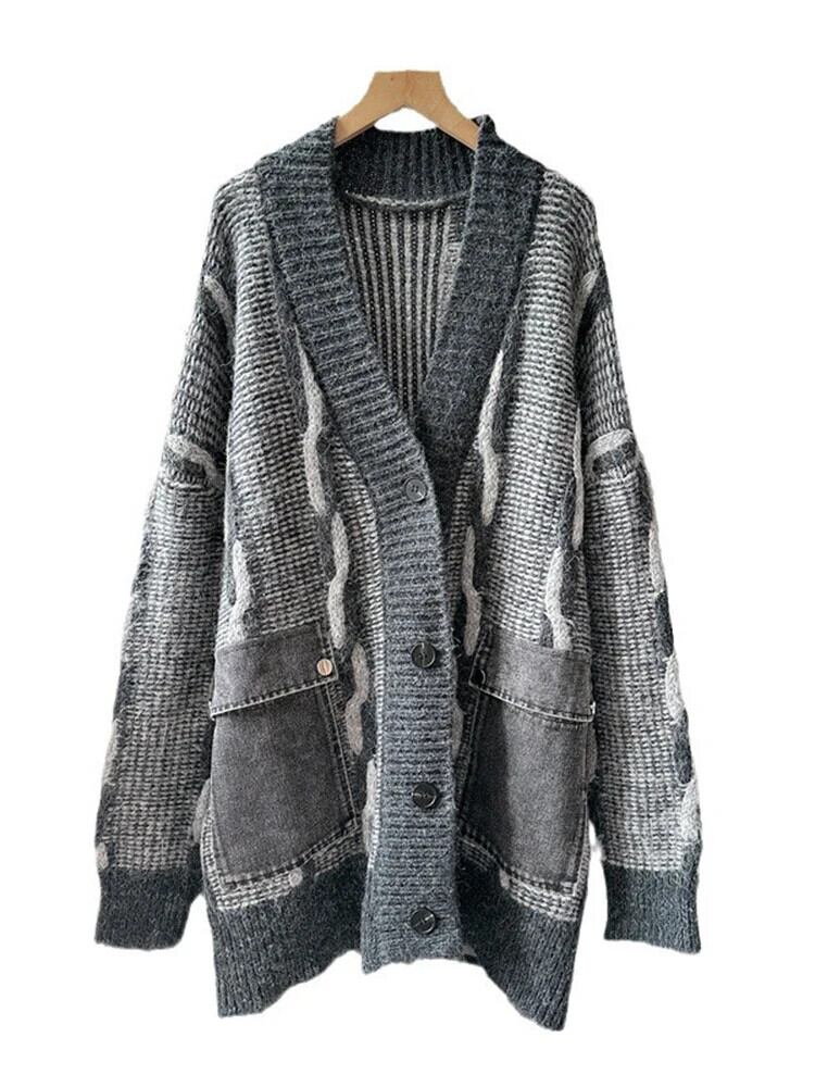 [EWQ] デニムポケットパッチワーク V ネックニットカーディガンセータールーズ長袖ニットトップ秋 16U5612 ロング オータム 秋物 Vネック