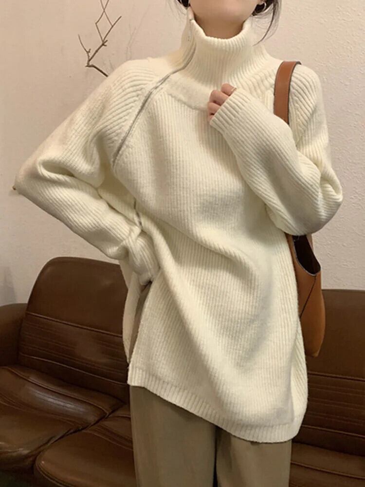 [EWQ] ブラック ホワイト グレー タートルネック ジッパー 長袖 厚みある レディース カーディガン ニット セーター 秋冬 16U6116 ロング オータム 秋物 ウィンター 冬物