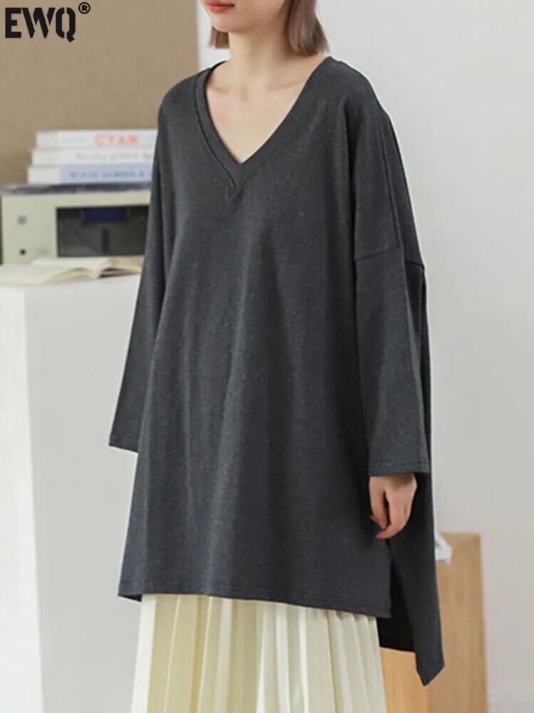 [EWQ] Vネック ショルダー 長袖 厚手 コットン 前ショート 後ろロング レディース トップス Tシャツ 秋冬 16U6085 オータム 秋物 ウィンター 冬物