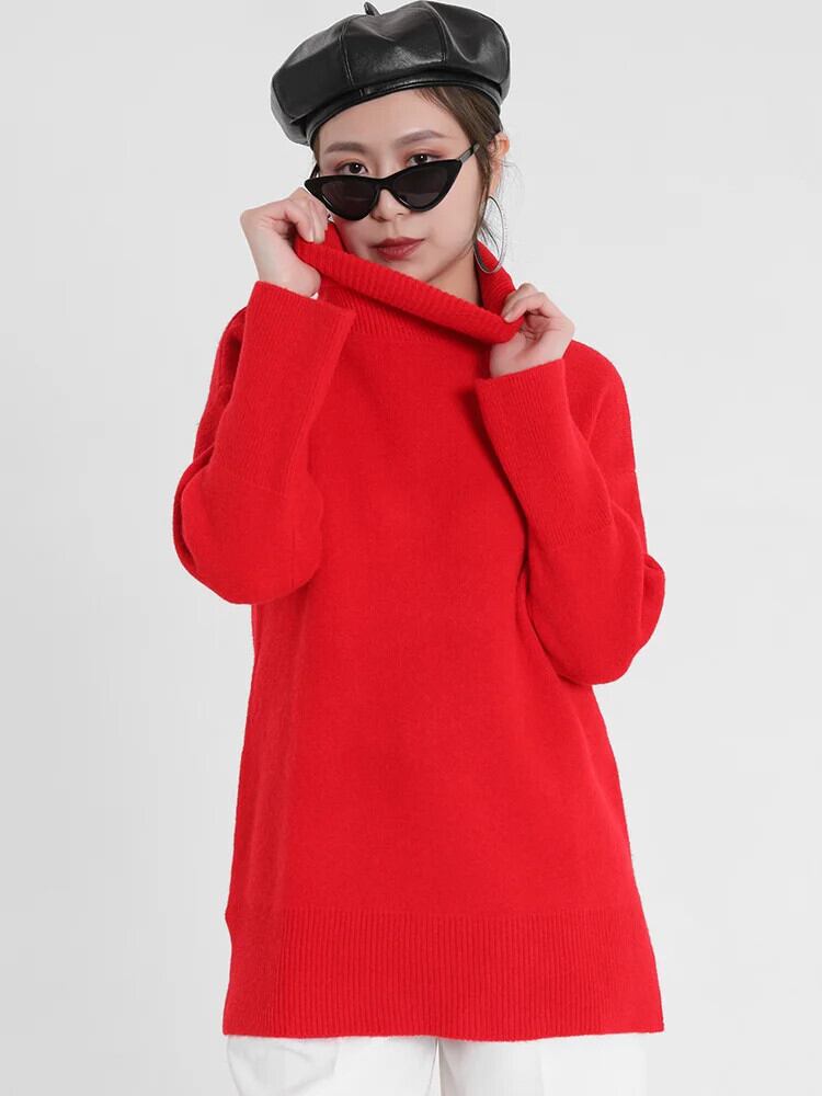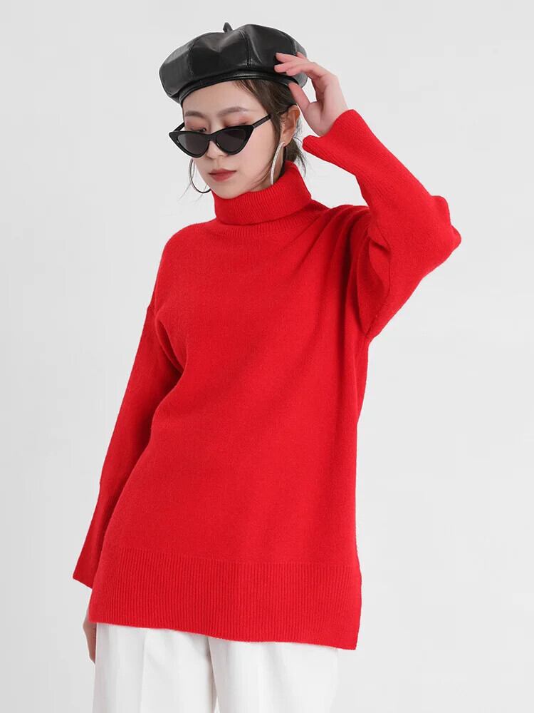 [EWQ] 不規則トレンドルーズクリスマスタートルネックルーズ長袖セーター秋レッドニットプルオーバー E315 ロング オータム 秋物