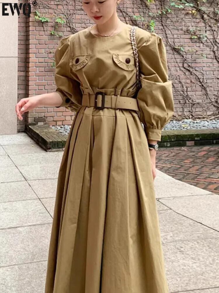 [EWQ] カーキドレスベルト長袖 O ネックプリーツドレスパーティー Vestido 秋冬 6U4449 ロング オータム 秋物 ウィンター 冬物 ハーネス Oネック