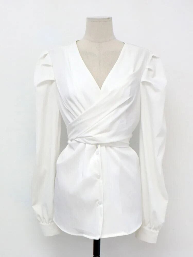 [EWQ] ブラックホワイト V ネックシングルブレストプリーツウエストスリムバブルスリーブシャツブラウストップ春秋 16U6285 スプリング 春物 オータム 秋物 Vネック