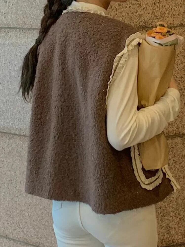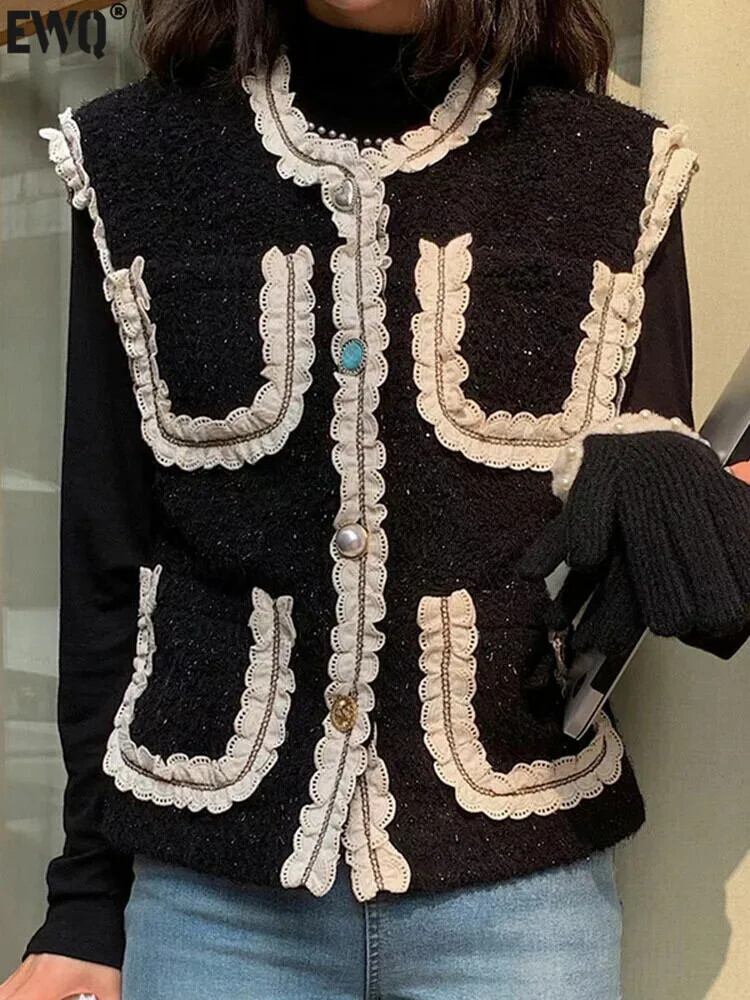 [EWQ] マルチポケットシングルブレスト O ネックコントラストカラーレースエッジノースリーブベストコートジャケット秋冬 16U5877 オータム 秋物 ウィンター 冬物 Oネック ポケット多め