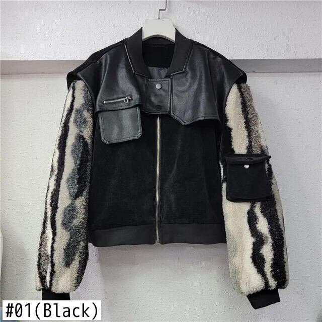 [EWQ] ラムズウールスプライシングフェイクファーコートストリート厚い Pu レザーパッチワークジャケット秋冬 16U5291 オータム 秋物 ウィンター 冬物