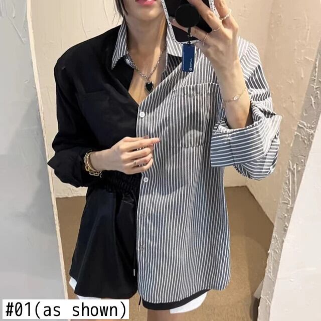 [EWQ] 春秋ポロカラーシングルブレストコントラストカラーストライプゆったり長袖シャツレディース 16U5707 ロング スプリング 春物 オータム 秋物