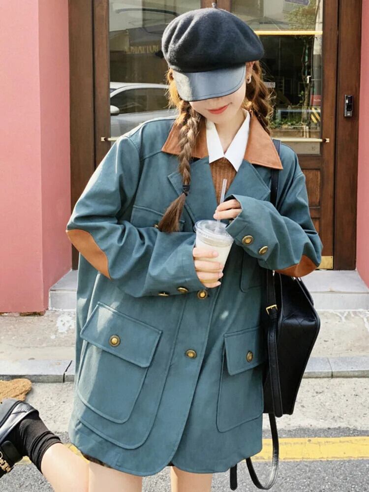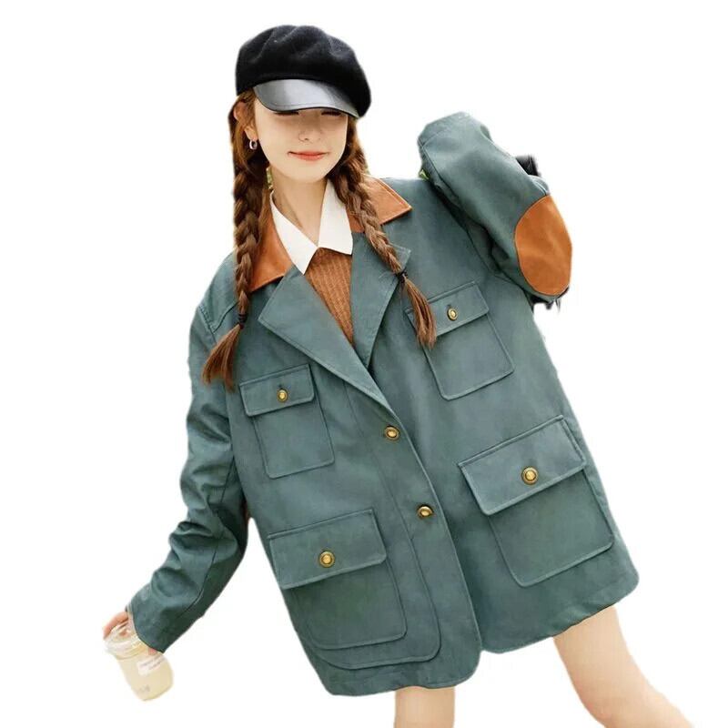 [EWQ] PU パッチワークコントラストジャケット長袖レザースプライシングルーズジャケットコート秋冬 16U4223 ロング オータム 秋物 ウィンター 冬物