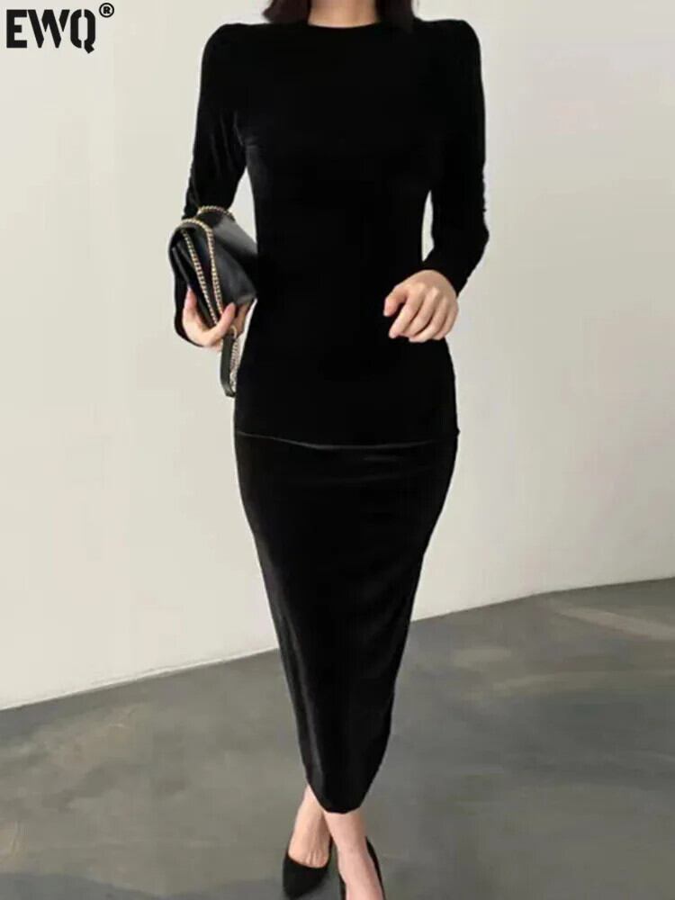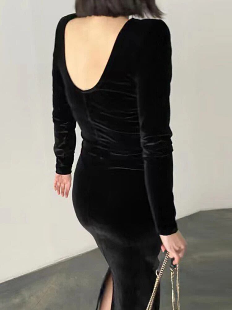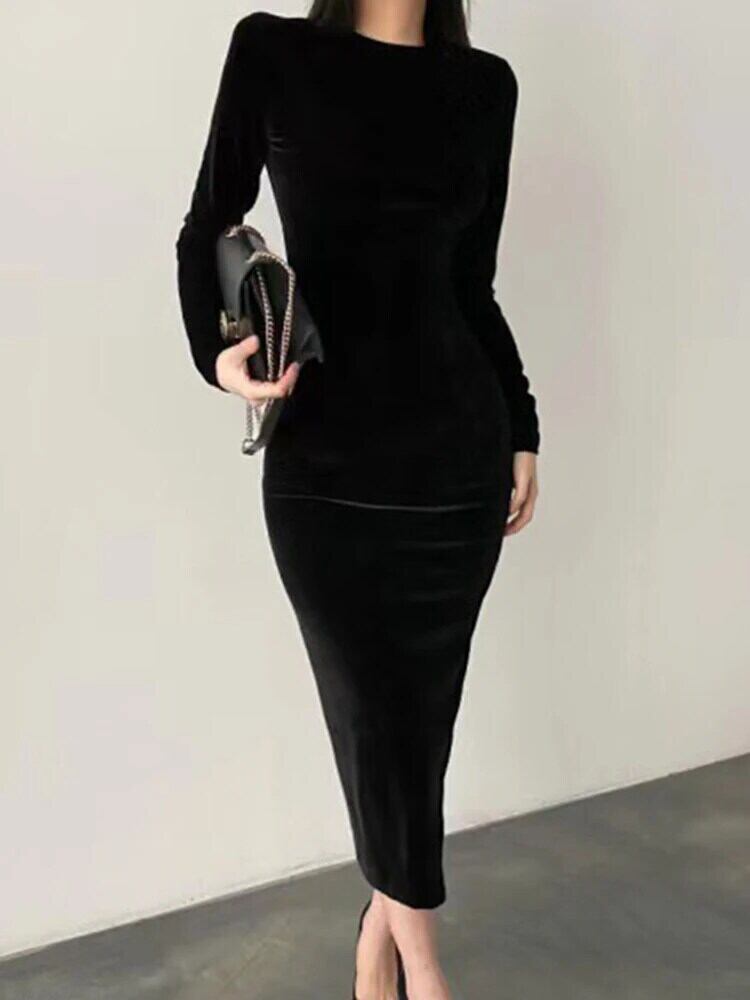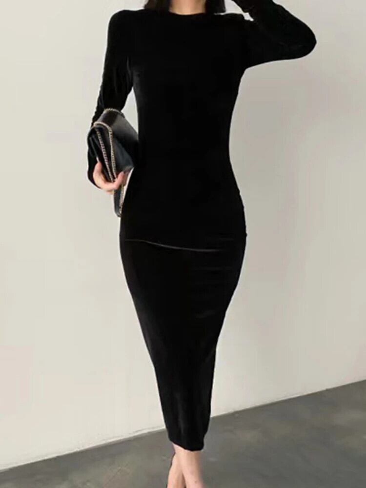 [EWQ] 黒ソリッドカラー気質 O ネックスリムラップヒップベルベットバックレスロングドレス秋冬 16U6241 ブラック オータム 秋物 ウィンター 冬物 Oネック