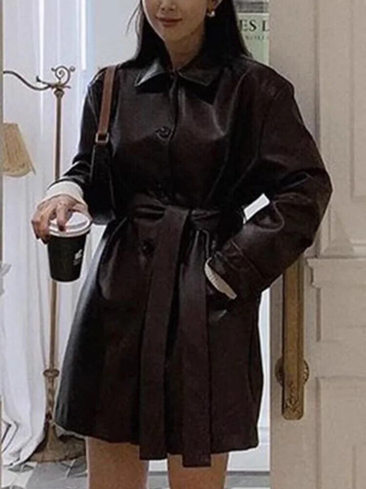 [EWQ] シングルブレストストラップウエストスリム長袖 PU レザージャケットコートウインドブレーカーボンバー秋冬 16U5918 ロング オータム 秋物 ウィンター 冬物