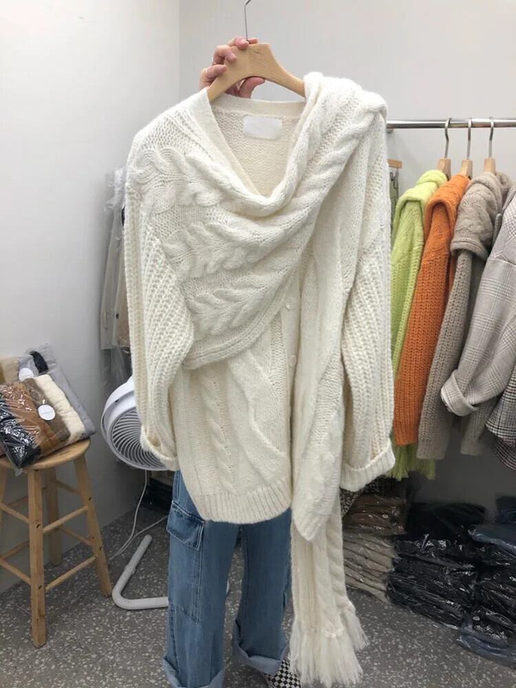 [EWQ] シングルブレスト秋冬レディーススカーフ襟ステッチバックルカーディガンニットセーターコートアウター U5734 オータム 秋物 ウィンター 冬物