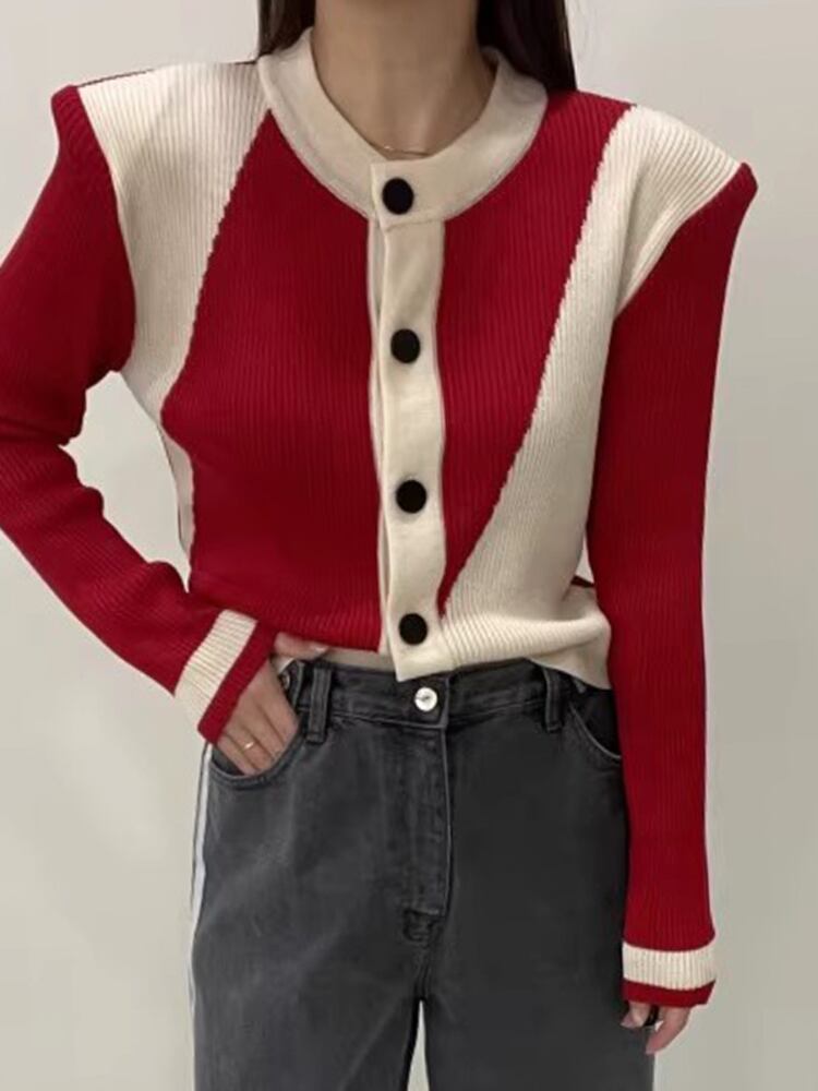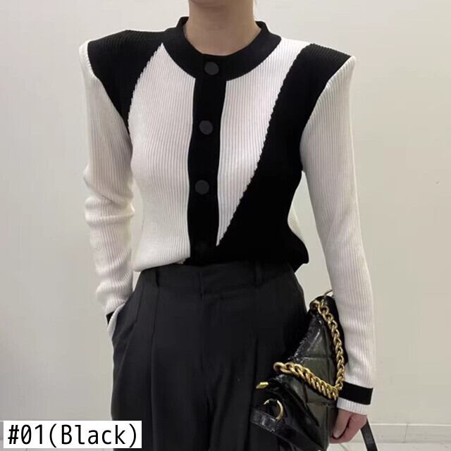 [EWQ] コントラストショルダーパッドカーディガンコートパッチワーク多用途弾性スリムセータージャケット秋冬 16U5235 エラスティック 伸縮 オータム 秋物 ウィンター 冬物
