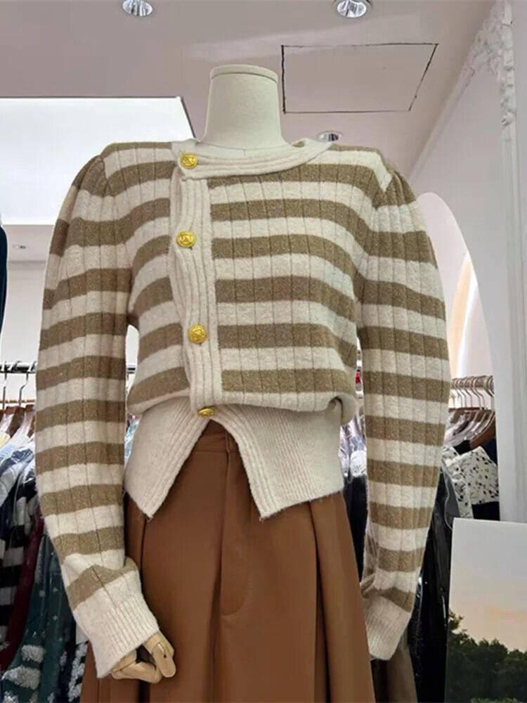 [EWQ]イレギュラー秋冬ストライプ婦人バブルスリーブ暖かいセーターニットカーディガンコートジャケットトップス16U5759 オータム 秋物 ウィンター 冬物