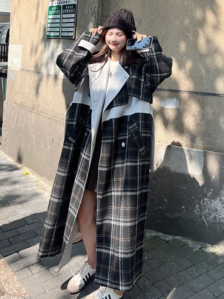 [EWQ] 黒チェック柄ウールコートゆったり厚手長袖パッチワークコントラストオーバーガーメントジャケット秋冬 16U4667 ロング ブラック オータム 秋物 ウィンター 冬物