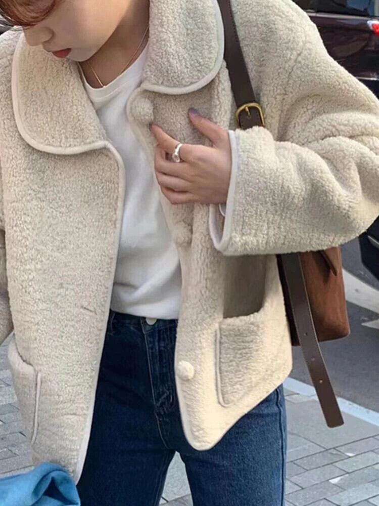 [EWQ] プラッシュ パッチワーク アプリコット ラムウール ジャケット ルーズ シック ラペル シングルブレスト ショート コート 秋 16U5506 オータム 秋物