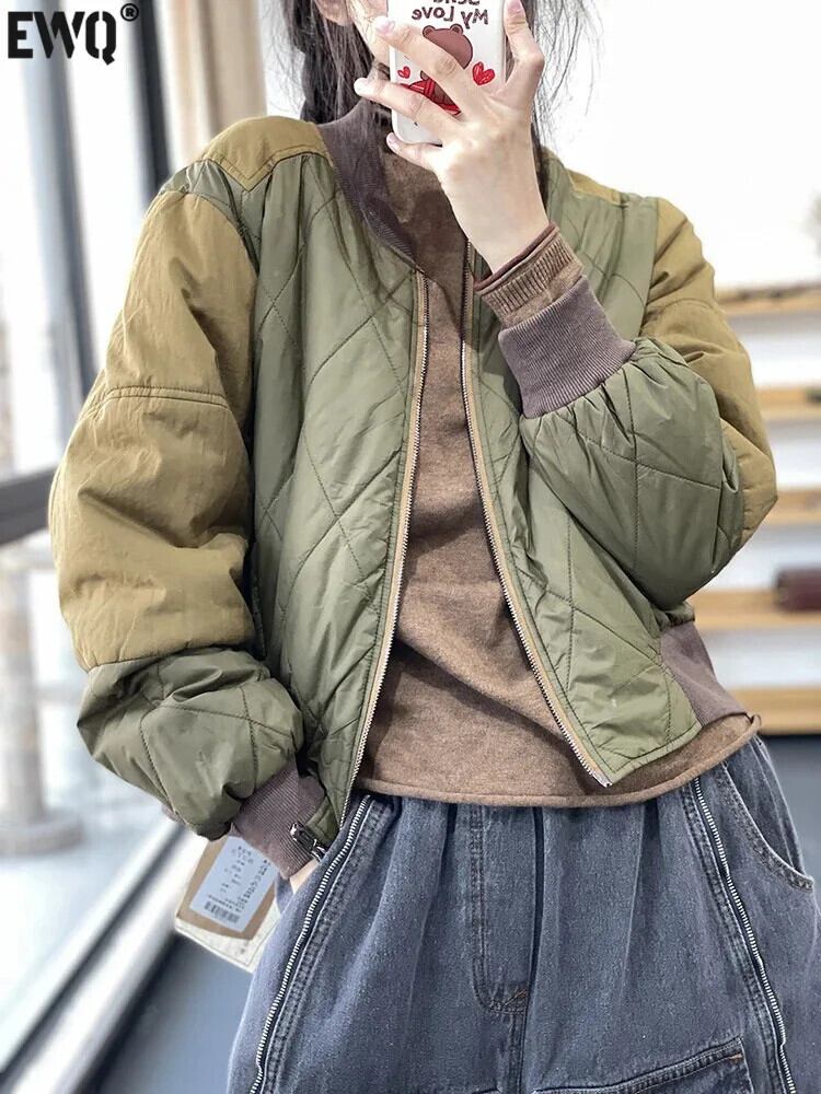[EWQ] パッチワーク スタンドカラー ジッパー コントラストカラー ダイヤモンド チェック柄 コットン コート ジャケット ベースボール ジャージ 秋冬 16U6330 オータム 秋物 ウィンター 冬物