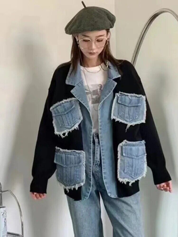 [EWQ] 長袖 ビッグサイズ セーター アウター デニム パッチワーク ポケット トレンド 暖かい レディース 秋冬 ジャケット 16U4271 ロング オータム 秋物 ウィンター 冬物