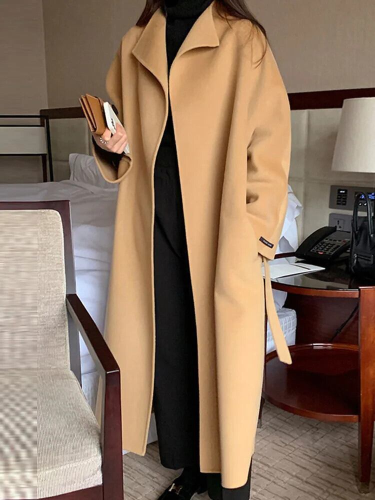 [EWQ] ラペルレースアップウエスト長袖カーキウールカーディガンオーバーコートアウターブラウンウールジャケット秋冬 U5866 ロング オータム 秋物 ウィンター 冬物