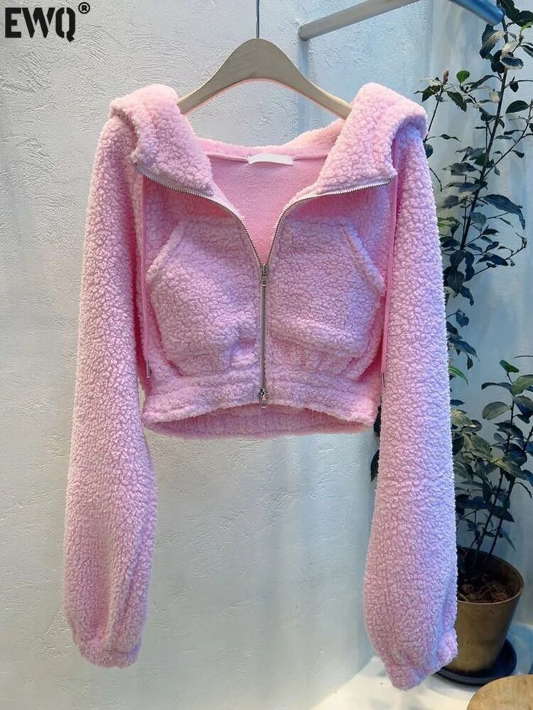 [EWQ] ジッパー 長袖 巾着 フード付き カーディガン ラムポケット ショート コート ジャケット アウター 秋冬 16U5842 ロング オータム 秋物 ウィンター 冬物