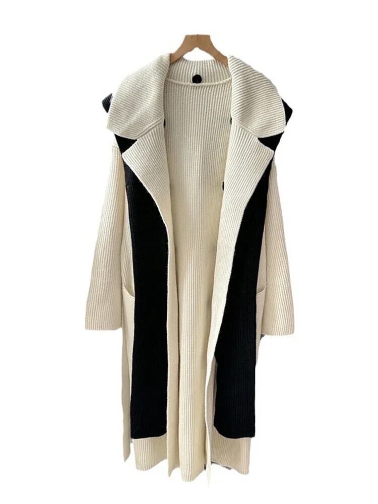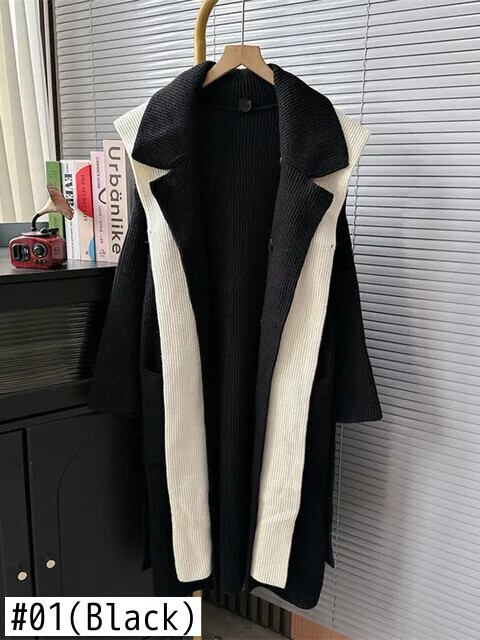 [EWQ] フード付きラペルルーズロングコントラストカラーニットカーディガンセーターアウタージャケットコート秋冬 16U5783 オータム 秋物 ウィンター 冬物