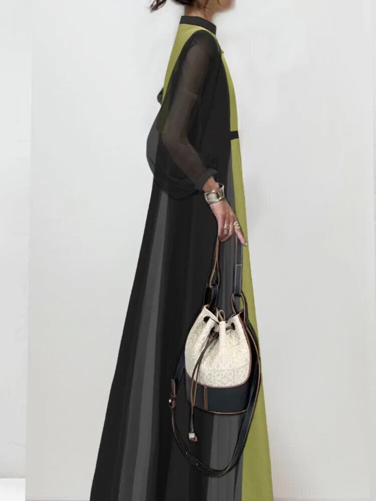 [EWQ] 長袖パッチワークコントラストドレス弾性ウエスト O ネックボタンドレスローブ秋冬 16U5193 ロング エラスティック 伸縮 オータム 秋物 ウィンター 冬物 Oネック