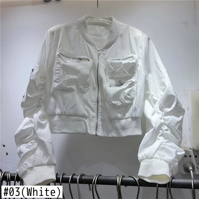 [EWQ] 長袖ビッグサイズアウターシックピンクボンバージャケット 3D 大きポケット白衣秋ジッパー ロング ホワイト オータム 秋物