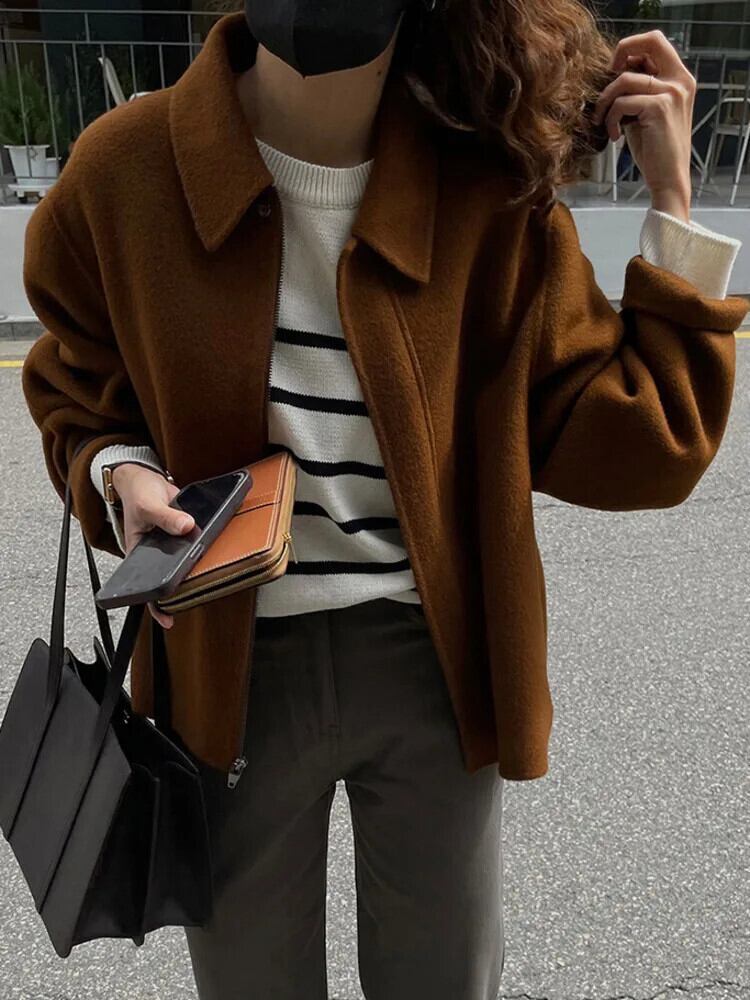 [EWQ] ブラックグレートップスラペルジッパー長袖ショートブラウンウールコートオーバーコートジャケットアウター冬秋 U606 ロング オータム 秋物 ウィンター 冬物