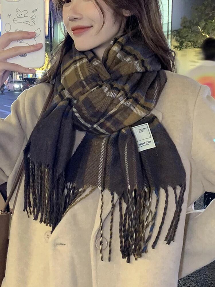 [EWQ] コントラスト ニット テル スカーフ レディース 秋冬 厚みある 暖かい ネック グラデーション チェック柄 ショール 16U4862 オータム 秋物 ウィンター 冬物