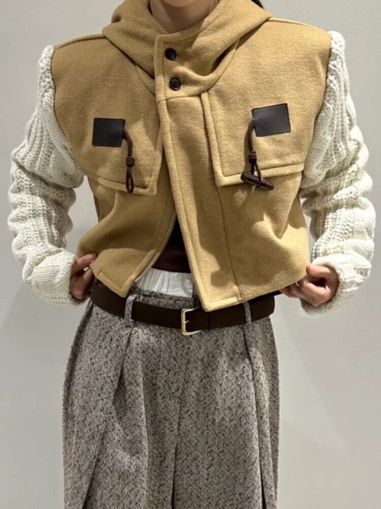 [EWQ] コントラストカラーフード付きジッパーパッチワークニットショートウールコートルーズジャケット秋冬 16U6259 オータム 秋物 ウィンター 冬物