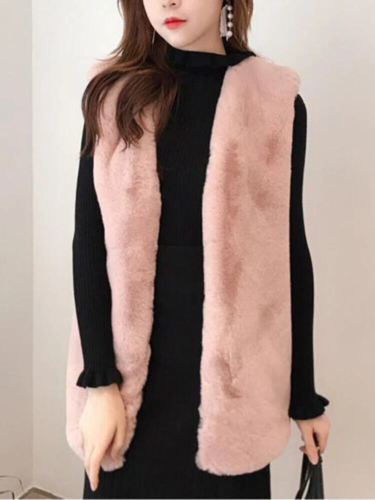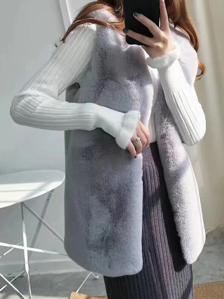 [EWQ] ノースリーブ マルチカラー レディース ミドル丈 スリム フェイクレッキスラビットファー カーディガン ベスト コート トップス 秋冬 16U5949 オータム 秋物 ウィンター 冬物