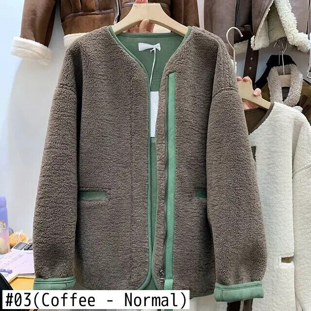 [EWQ] ジッパーコントラストカラー V ネック長袖厚く暖かいレディースラムウールコートアウター秋冬 16U6136 ロング オータム 秋物 ウィンター 冬物 Vネック